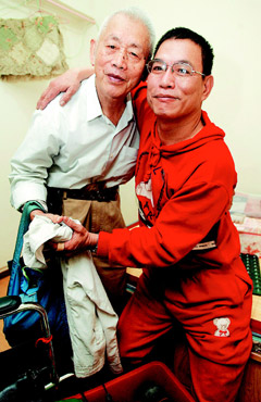 提著藍色布包,87歲的胡偉昨天早上搭著公交車來到中山女高校門口,加入善愿愛心協(xié)會志工的行列,這是他七年多來每周日例行活動,風雨無阻。他是協(xié)會“國寶級”志工,因年歲大行動較為緩慢,昨天他一如往常與其它志工前往受助人家中,駝著背將捐出的1000元善款交到小他26歲的身障者蔡行展手里。