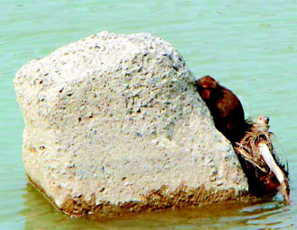 據(jù)臺(tái)灣聯(lián)合報(bào)報(bào)道,林務(wù)局工作站人員昨天上午經(jīng)過高雄縣旗山鎮(zhèn)旗尾溪,發(fā)現(xiàn)有只臺(tái)灣小獼猴受困溪中,緊抱著溪中大石面對(duì)滾滾洪流動(dòng)彈不得。