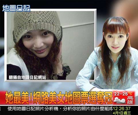 “想知道誰是臺灣最美的女性嗎?地圖日記網(wǎng)站日前舉辦美女票選,活動一個月就突破千萬的瀏覽率…”,玄藏大學大三生劉伊珊一周前上傳自拍照片,制成網(wǎng)絡美女票選奪冠的頭條新聞,沒想到還成功騙倒兩個同學。劉伊珊說,當初只是想給同學一個驚喜,竟還有同學看到之后問,“你真的上電視喔?”