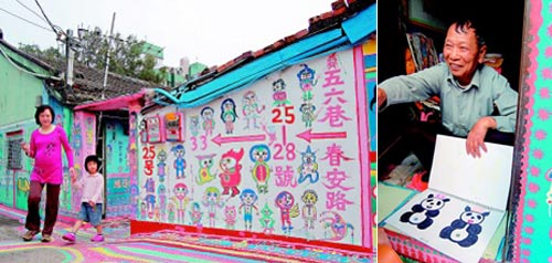 中新網(wǎng)4月7日電 據(jù)臺(tái)灣《聯(lián)合報(bào)》報(bào)道,臺(tái)中市有處五彩繽紛的彩繪眷村,墻面、地板畫滿人像、動(dòng)物與色塊,夢(mèng)境般場(chǎng)景吸引大批博客、攝影玩家,孤寂的眷村頓時(shí)熱鬧起來(lái);這些圖畫都出自86歲退伍老兵黃永阜之手,他說(shuō),畫圖是排遣無(wú)聊,沒(méi)想到大家喜歡,讓他越畫越起勁。