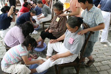 臺灣中部的南投,慈濟(jì)基金會(huì)南投縣草屯聯(lián)絡(luò)處除舉辦浴佛大典,也讓為人子女者有機(jī)會(huì)為父母或長輩奉上一杯熱茶,并為他們浴足。