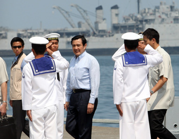 馬英九上午在“國(guó)安會(huì)”秘書長(zhǎng)蘇起、“國(guó)防部長(zhǎng)”陳肇敏等人陪同下,搭乘專機(jī)南下左營(yíng)海軍基地,分別前往水星碼頭及柴山山訓(xùn)場(chǎng)視導(dǎo)并慰勉臺(tái)軍官兵。