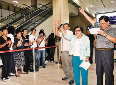 許榮淑踏進(jìn)入境大廳,立刻有掌聲為她加油,三重市黨部動(dòng)員許多民眾接機(jī),可是仔細(xì)一看,這一整群的支持者還真有殺氣,穿著打扮不是黑就是白,即使在室內(nèi)也要戴墨鏡,就像在拍香港古惑仔的電影,身上的刺青格外引人注目,唯一跟港版古惑仔不同的是,臺灣的熱血男兒們嚼著檳榔。這些支持者不但搭4輛游覽車來相挺,還帶著打扮清涼火辣的辣妹一同觀摩政治人物如何造勢。