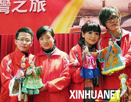 1月14日,兩岸新人在體驗(yàn)臺(tái)灣布袋戲時(shí)合影留念。來自大陸的26對(duì)新人搭乘兩岸直航班機(jī)來到臺(tái)灣,將參加于1月15日在日月潭舉行的“日月同喜,喜傳天下”集體婚禮并游覽臺(tái)灣名勝古跡,感受當(dāng)?shù)仫L(fēng)土人情。新華社圖