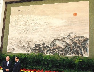 中新網(wǎng)5月29日電 中共中央總書記胡錦濤28日在北京人民大會堂會見中國國民黨主席吳伯雄一行。臺灣媒體注意到,雙方在“江山如此多嬌”巨幅畫前合影留念,蘊含深意。