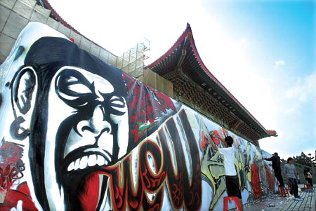 中新網(wǎng)10月22日電 據(jù)臺灣《中國時報》報道,昨日天氣晴朗,民眾紛紛外出走動,臺北“中正紀念堂”內(nèi)雖然有兩廳院屋宇修復(fù)工程,卻也舉行快樂涂鴉活動,邀請涂鴉高手在圍籬上一展身手,為修繕中的兩廳院增添了不同的面貌。