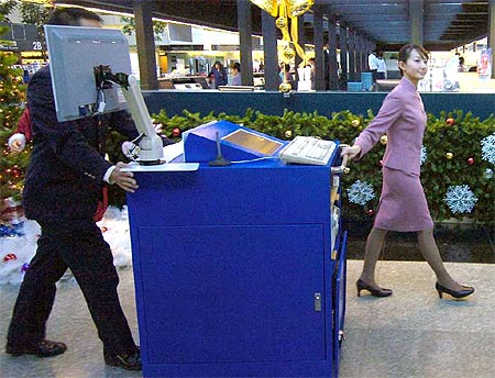 臺灣華航公司為提供更快速便捷的服務(wù),在桃園機場推出“移動柜臺”,隨時轉(zhuǎn)至各地點,以彌補固定柜臺不足的缺點。旅客可快速辦理登機手續(xù),大型托運行李也有專人服務(wù),節(jié)省不少時間!吨袊鴷r報》圖 洪圣飛 攝