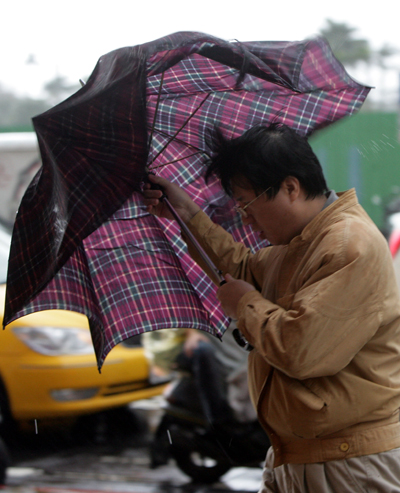 米塔臺風(fēng)二十六日下午已轉(zhuǎn)為輕度臺風(fēng),臺灣氣象部門預(yù)測米塔臺風(fēng)暴風(fēng)圈將會縮小,但外圍環(huán)流與鋒面共伴效應(yīng)為臺灣島北部及東部帶來的豪雨仍會持續(xù)。圖為行人在雨中艱難行進(jìn)。“中央社”圖 張皓安 攝