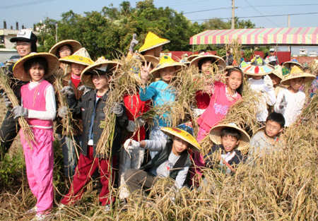 臺(tái)灣省南投縣草屯鎮(zhèn)炎峰小學(xué)四年級(jí)學(xué)生日前體驗(yàn)水稻插秧,經(jīng)過(guò)一期的水稻長(zhǎng)成,小小農(nóng)夫三十日下田收割,體驗(yàn)農(nóng)民收割稻谷的辛苦與歡欣!爸醒肷纭眻D 曾立 攝