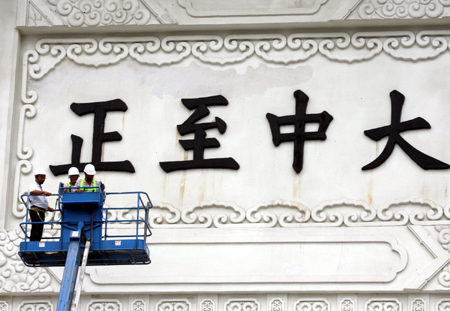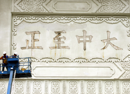 臺北中正紀念堂前面的“大中至正”牌匾拆卸工程七日下午進行順利,拆下最后的“正”字,牌匾歲月痕跡明顯。圖為拆卸前后對比!爸醒肷纭眻D 郭日曉 攝