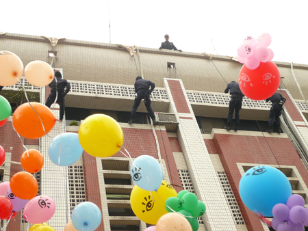 臺(tái)灣屏東地檢署十八日舉辦反賄選的造勢宣傳,以背十字架和套枷鎖提醒候選人賄選“遺臭萬年,活罪難逃”。還有霹靂小組在“鐘馗的法眼”氣球群中垂吊而下,象征檢警調(diào)布滿天羅地網(wǎng),法眼難逃!爸醒肷纭眻D 郭芷瑄 攝