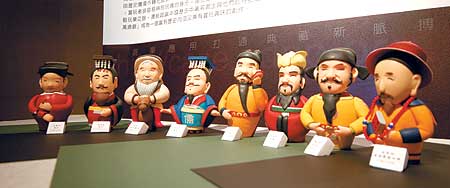 臺灣第二屆數(shù)字典藏商業(yè)應(yīng)用大賽得獎作品公布,臺灣藝術(shù)大學(xué)三年級學(xué)生倪敏,把歷代皇帝變成Q版公仔(玩偶),創(chuàng)作《萬歲爺——三皇五帝》系列公仔,勇奪人物玩偶設(shè)計組第一名。 《中國時報》圖 李宗佑 攝