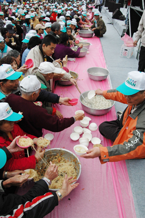 臺(tái)灣省宜蘭縣羅東中山公園廣場(chǎng)二十九日舉辦“立委”選舉造勢(shì)大會(huì),近中午時(shí),主辦單位在舞臺(tái)擺上十多盆的炒米粉及魚(yú)丸湯,兩三百名民眾爭(zhēng)相搶食!爸醒肷纭眻D 沈如峰 攝