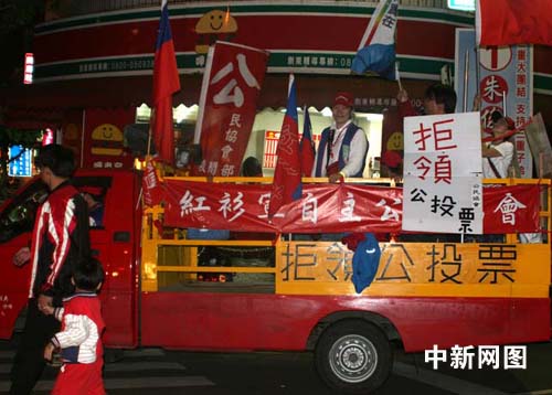 第七屆臺灣“立委”選舉12日舉行。圖為11日晚,紅衫軍在掃街催票時訴求拒領(lǐng)“公投”票。中新社記者 陳立宇 攝