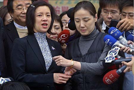 前臺(tái)灣《獨(dú)家報(bào)導(dǎo)》發(fā)行人沈嶸(右)因雜志附贈(zèng)璩美鳳性愛(ài)光盤(pán)一案遭判刑二年,經(jīng)服刑三百六十四天后于二十六日假釋出獄。光盤(pán)主角璩美鳳盡釋前嫌,親自前往桃園監(jiān)獄迎接沈嶸。圖為沈嶸與璩美鳳緊握雙手,在媒體的包圍下離開(kāi)監(jiān)獄。圖:臺(tái)灣《中國(guó)時(shí)報(bào)》