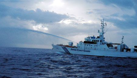 臺(tái)灣“全家!北a灤沾钶d著保釣人士前往釣魚(yú)島宣示“主權(quán)”,不過(guò),日本保安廳巡邏艦出動(dòng)十多艘,還噴水、企圖碰撞、排黑煙、及蛇行引側(cè)浪企圖阻撓。保釣人士丟擲飲料瓶抗議!爸醒肷纭眻D