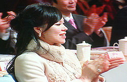 2009年1月23日鴻海舉辦年終尾牙,董事長(zhǎng)郭臺(tái)銘開(kāi)心地開(kāi)起玩笑說(shuō),“大家要努力,因?yàn)榇蠹业呐,關(guān)系到我未來(lái)下一代的奶粉錢”,在臺(tái)下愛(ài)妻曾馨瑩,面帶微笑聆聽(tīng)郭董談話。圖片來(lái)源:中國(guó)時(shí)報(bào)