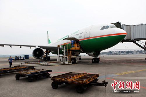 中新網(wǎng)重慶5月26日電 (記者 郭晉嘉)隨著富士康、英業(yè)達(dá)等臺(tái)企入駐重慶,今年以來(lái)渝臺(tái)直航航線客運(yùn)持續(xù)火爆,貨運(yùn)開(kāi)始升溫。5月26日,臺(tái)灣立榮航空的B7192航班由麥道90機(jī)型改為252座的空客330機(jī)型執(zhí)飛,這是重慶—臺(tái)灣航線首次采用大型寬體機(jī),也是首次大批運(yùn)送貨物。