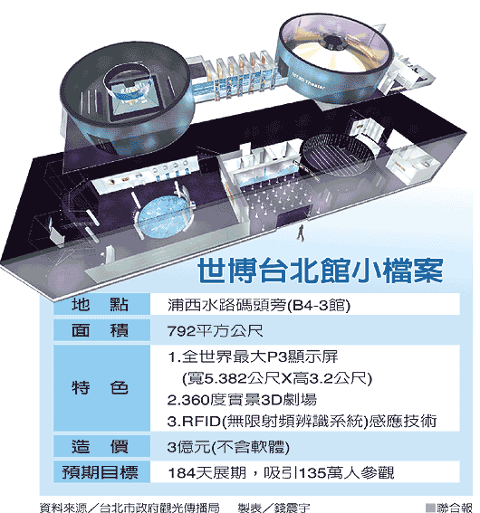 世博會(huì)臺(tái)北館館長(zhǎng)陳慶安表示,館內(nèi)一次開(kāi)放84人參觀,全程參觀時(shí)間36分,以一天開(kāi)放13個(gè)小時(shí)計(jì)算,約有2184人參觀。臺(tái)北館預(yù)計(jì)4月16日完工驗(yàn)收,4月20日開(kāi)放試營(yíng)運(yùn)。