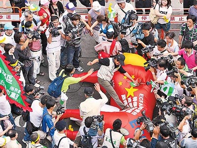在臺(tái)北游行的一些綠營(yíng)民眾因不滿馬英九與大陸簽署經(jīng)濟(jì)合作架構(gòu)協(xié)議(Economic Cooperation Framework Agreement,ECFA),準(zhǔn)備了紅色巨型充氣馬玩偶,上面畫(huà)有我五星紅旗標(biāo)志,還寫(xiě)著“ECFA傾中賣(mài)臺(tái)”等文字,并煽動(dòng)民眾踢踹泄憤。
