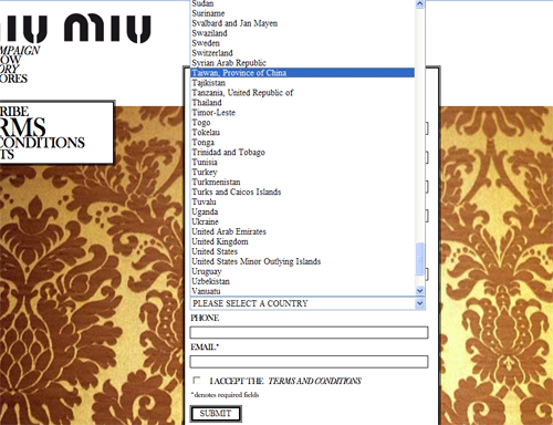 中新網(wǎng)6月5日電 據(jù)臺灣TVBS報道,知名咖啡連鎖店日前才因?yàn)榫W(wǎng)頁把臺灣列為中國一省遭到島內(nèi)一些消費(fèi)者發(fā)動拒買抗議,現(xiàn)在又傳出意大利高級皮件品牌MIUMIU,在官網(wǎng)訂閱電子報里的國家欄,將臺灣列為中國一省。對此,綠營又拿出來說事。