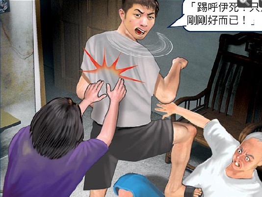 沈父倒在地上不斷哀號,在房內(nèi)睡覺的沈弘隆姑姑趕緊跑出來察看,大喊:“不要打了!”一把將侄子推開說:“當兒子的,怎么可以打老爸。”但沈弘隆失去理性,還回嗆姑姑說:“踢呼伊死(指沈父)!只是剛剛好而已!”甚至拉開姑姑,再踢了父親一腳,才掉頭逃離現(xiàn)場。