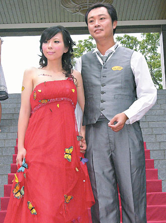 中新網8月27日電 10月舉行婚禮的準新娘陳韻如,26日試穿一款“蝴蝶禮服”,紅色低胸禮服上,“!敝30多只活體蝴蝶,遠望仿佛蝴蝶彩繪圖。不過,十分鐘后,緞面禮服上動也不動的蝴蝶突然展翅飛舞,驚艷全場。