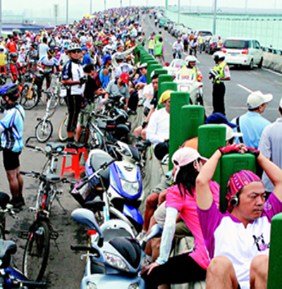 縣政府原計(jì)劃將無(wú)車(chē)日活動(dòng)設(shè)在板橋文化路的捷運(yùn)新埔站,要車(chē)友在這里集結(jié)上橋,后來(lái)報(bào)名參加車(chē)友實(shí)在太多,昨天緊急調(diào)整通車(chē)典禮會(huì)場(chǎng)至臺(tái)64線道路的16.3公里處,也就是五股交流道附近。沒(méi)想到清晨4時(shí)起就有車(chē)友成群結(jié)隊(duì)上橋,卻在16.3公里處被擋駕,他們耐心等候7時(shí)30分通車(chē)典禮,沒(méi)想到因人太多,近七萬(wàn)車(chē)友和愛(ài)車(chē)就硬被堵在高架橋上。