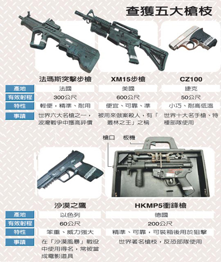 不乏島內(nèi)首見的槍型中,例如手提箱式MP5沖鋒槍,可從手提握把直接扣扳機(jī),外觀與一般手提箱無異,使用者提著它走進(jìn)人群,就算是“總統(tǒng)級”的維安也防不勝防,故有人稱它“要命的手提箱”,黑市價格應(yīng)在百萬元以上,警方認(rèn)為訂貨者動機(jī)可疑,準(zhǔn)備用它來刺殺誰,有查明必要;另有9把以色列突擊步槍,浸泡海水后可立即使用,也是首次查獲。