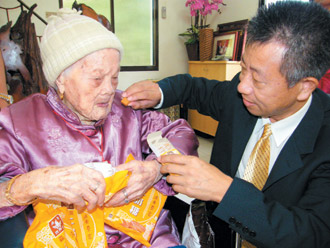 副縣長陳興照等人昨天探視老奶奶,為她戴上金鎖片,祝她重陽節(jié)快樂,老奶奶歡喜迎接客人,看到廠商送來6大箱不同口味的牛奶糖,更是笑開懷。