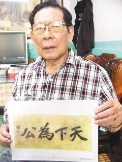 他說(shuō),孫中山以一百七十八公分長(zhǎng)、八十六公分寬絹本橫幅,親手寫(xiě)的“天下為公”墨寶,就交給他叔公保管至今,保存得十分完好。