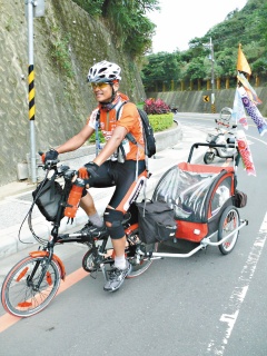 戴正東的“小拖車”其實(shí)是單車外掛的嬰兒車,他原本用來(lái)載體重26公斤混種獅毛犬出游,為了自行車環(huán)島,就用小拖車放置睡袋、帳篷、換洗衣物、小型充電器等裝置,重量達(dá)30公斤。