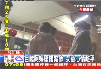 下午6點(diǎn)多,女童和林姓女子出門回家,發(fā)現(xiàn)忘了帶鑰匙,林姓女子打開樓梯間的窗戶,想爬到家里陽臺,但卻失足從4樓高摔下,頭先撞到雨棚再掉到1樓,當(dāng)場斃命;小女童目擊一切,小小心靈受傷,恐怕一時半刻難以平復(fù)。