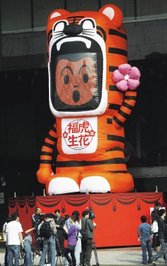 中新網(wǎng)2月11日電 據(jù)“中央社”報道,2010臺北燈節(jié)26日起一連舉行10天,除傳統(tǒng)花燈外,臺北市政府文化局今年結(jié)合當(dāng)代藝術(shù),規(guī)畫“公共藝術(shù)燈區(qū)”,在市府大樓門前及上方放置2只可愛的“開心福虎”,并將征募6666位民眾的大頭照,在燈節(jié)期間投影在臺北市政大樓的外墻上。