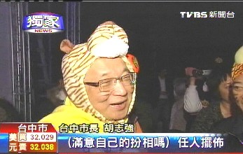 臺(tái)中市長(zhǎng)胡志強(qiáng)扮成老虎,并圍上一條“老虎圍巾”,所有參加臺(tái)中燈會(huì)的貴賓坐在位子上整齊劃一,不論穿的是西裝還是休閑服,都在脖子上加了條亮黃色圍巾……這是臺(tái)中市府的創(chuàng)意,圍巾左右兩邊是老虎尾巴,做成英文字母T,代表臺(tái)中Taichung,還有老虎Tiger。