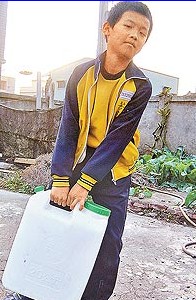 過去爸爸住院期間,洪銘楠幾乎每天搭車到醫(yī)院照顧爸爸,父親去世后,因祖母患有嚴(yán)重的糖尿病,無法提重物,他也從兩年前開始每天到加水站扛飲用水回家,不過四十多公斤的孩子,雙手提著裝滿二十公斤水的塑料桶,一步一步慢慢走回家,水的重量幾乎是他體重的一半。