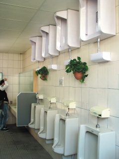 “咦! 小便斗、馬桶怎么倒置在墻上、天花板?”走進臺灣醒吾技術學院的廁所,如果抬頭看,恐會一時反應不過來,以為眼花了,天花板又是地板,地板是天花板,人仿佛變成倒立站在天花板上廁所了。