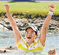 中新網(wǎng)4月6日電 據(jù)臺灣媒體報(bào)道,臺灣高球天后曾雅妮5日在LPGA(Ladies Professional Golf Association,女子職業(yè)高爾夫巡回賽)四大賽之一、納比斯科錦標(biāo)賽中擊敗世界前10名高手,奪下后冠,獲得30萬美元獎金,也是賽史上第1位摘冠的華人球員。曾雅妮奪冠后激動得舉起雙手,興高采烈地依照傳統(tǒng)躍進(jìn)水池中慶祝。