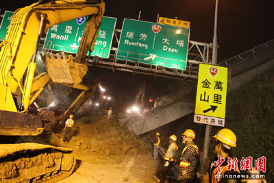 今天深夜搶救現(xiàn)場持續(xù)下起小雨,許鉦漳說,會確保現(xiàn)場施工人員安全,做好周全準備,并決定改為逐層開挖,就算下雨也將持續(xù)清運。北上車道已經(jīng)降低土方約12公尺,南下車道已降低約6公尺。