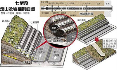 “國(guó)工局”規(guī)劃組地工科長(zhǎng)李有恒表示,巖錨打穿過(guò)地層滑動(dòng)面后,會(huì)往深處抓在不會(huì)滑動(dòng)的巖盤(pán)上。調(diào)閱資料顯示,災(zāi)變段最深巖錨達(dá)30多米。