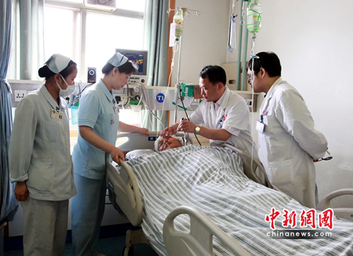 中新網(wǎng)長沙5月6日電(劉柱 伍西明)“多虧醫(yī)院救了我丈夫的命,歡迎你們來臺(tái)灣做客!”在湖南湘雅醫(yī)院重癥醫(yī)學(xué)科(ICU病房),剛剛從臺(tái)灣趕來長沙的臺(tái)胞患者梁登輝的夫人對(duì)病房里的醫(yī)生和護(hù)士們連聲感謝。