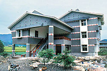 林志成2009年負責(zé)興建的“仰山會館”,也融入許多宜蘭厝的精神,包括一樓入口處半室內(nèi)空間與停車場結(jié)合,下雨時就可作為活動空間,外墻以宜蘭的洗石子傳統(tǒng)建材、斜屋頂適應(yīng)宜蘭的多雨天候;但他也表示,斜屋頂造成三樓會議空間的聲音無法集中,必須以不規(guī)則的天花板來修正音場。