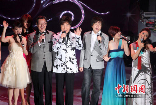5月8日,一代巨星鄧麗君逝世滿15周年,“但愿人長久—鄧麗君金曲慈善演唱會”當(dāng)晚在臺北登場,14位老中青實(shí)力派歌手演繹35首鄧麗君不同時(shí)期的經(jīng)典歌曲,令數(shù)千觀眾聽得如癡如醉。圖為演唱會尾聲,馬來西亞著名歌手梁靜茹(右2)、曾與鄧麗君搭檔的臺灣老歌手謝雷(左3)、“寶島閩南語歌王”洪榮宏(右3)、“小鄧麗君”蔡幸娟(左1)等人合唱《Goodbye My Love》。中新網(wǎng)駐臺記者 董會峰攝