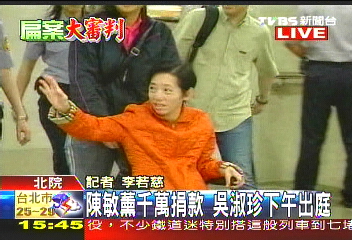 中新網(wǎng)6月15日電 據(jù)臺(tái)灣TVBS報(bào)道,陳水扁夫人吳淑珍15日下午再次到臺(tái)北地方法院開庭,針對前臺(tái)北101董事長陳敏熏的千萬捐款,法官傳喚前陳水扁辦公室主任馬永成,還有臺(tái)當(dāng)局前“財(cái)政部長”林全到庭說明。