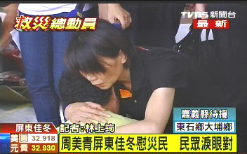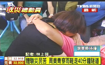 周美青難過(guò)與災(zāi)民相擁 入災(zāi)區(qū)體驗(yàn)逃生艱苦(圖)