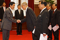 中新網(wǎng)9月10日電 據(jù)“中央社”報(bào)道,臺(tái)當(dāng)局新任“行政院長(zhǎng)”吳敦義今天下午率全體“閣員”在“總統(tǒng)府”宣誓就職,司儀逐個(gè)唱名名單,馬英九逐一對(duì)鞠躬“閣員”回禮。