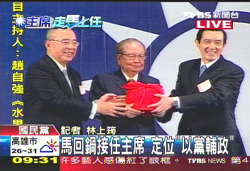 中新網(wǎng)10月17日電 馬英九17日上午接任中國(guó)國(guó)民黨主席,與吳伯雄進(jìn)行交接儀式,接下黨主席印信,傳承黨旗。