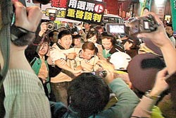 中新網(wǎng)11月25日電 據(jù)臺(tái)灣《中國(guó)時(shí)報(bào)》報(bào)道,國(guó)民黨主席馬英九24日晚在新竹縣新豐鄉(xiāng)及湖口鄉(xiāng)掃街拜票,為黨籍縣長(zhǎng)候選人邱鏡淳造勢(shì)時(shí),與民進(jìn)黨縣長(zhǎng)候選人彭紹瑾的隊(duì)伍相遇,雙方支持人馬爆發(fā)推擠沖突。雙方人馬短兵相接,一時(shí)旗桿橫飛,場(chǎng)面混亂,前后歷時(shí)五分鐘,沒有人員受傷。