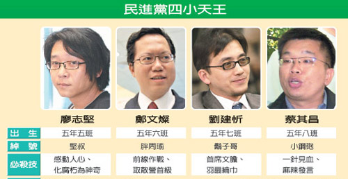 中新網(wǎng)12月14日電 在臺灣縣市長選戰(zhàn)結(jié)束后,深受民進(jìn)黨主席蔡英文倚重的“五年級F4”戰(zhàn)斗團(tuán)隊成形,民進(jìn)黨桃園縣長參選人鄭文燦、發(fā)言人蔡其昌、政策會首席副執(zhí)行長劉建忻、文宣部副主任廖志堅,儼然成為民進(jìn)黨的“四小天王”。