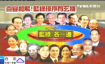 據(jù)報(bào)道,主桌最重要的位子是證婚人李登輝,再來是馬英九,順時(shí)針依序是連戰(zhàn)、王金平、吳伯雄、宋楚瑜、吳敦義、黃昆輝。而另一頭,李登輝夫婦旁邊,是呂秀蓮,民進(jìn)黨時(shí)代的“閣揆”張俊雄、游錫堃,藍(lán)綠雖然同桌,但壁壘分明,分坐兩邊。